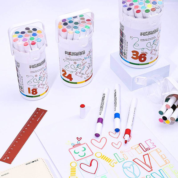 ماژیک‌ها در یک بسته‌بندی سطلی مقاوم قرار گرفته‌اند که هم ظاهر زیبا و هم حمل آسانی دارند.